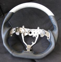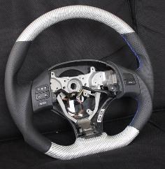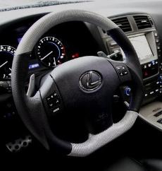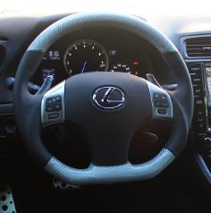 DCTMS Lexus IS silver carbon steering wheel with flat bottom design, black leather wrap with blue stitching silver carbon weave presents a good match with IS-F interior trims