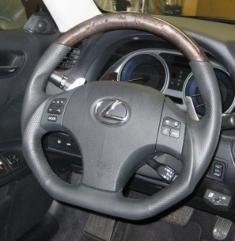DCTMS Lexus IS black leather steering wheel with flat bottom and wodo on top, black perforated leather wrap on sides; black smooth leather flat bottom and black stitching ST050T07W - with dark ash green wood grain ST050T08W - with cherry red wood grain