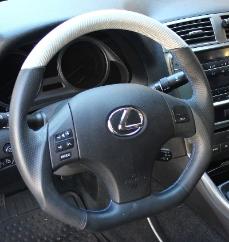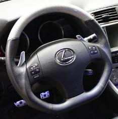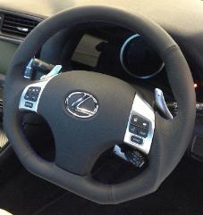DCTMS Lexus IS black leather steering wheel with flat bottom design, black perforated leather wrap on sides; black smooth leather top and flat bottom ST050T05L - with BLUE stitching ST050T06L - with BLACK stitching