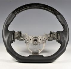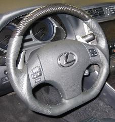 DCTMS Lexus IS black carbon steering wheel with flat bottom design, black perforated leather wrap on sides and black smooth leather flat bottom ST050T03C - with BLUE stitching ST050T04C - with BLACK stitching